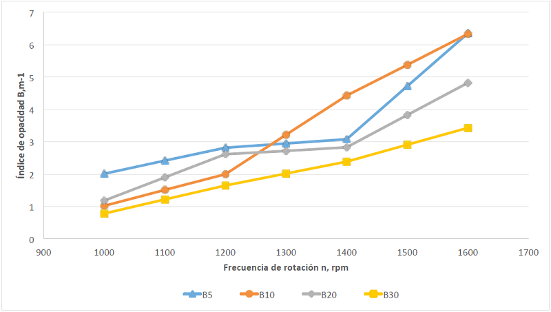 Behcet et al. (2014) mencionan que, al incrementar la frecuencia de rotación del motor, aumenta el chorro de aire, los movimientos rotacionales y de turbulencia, los cuales optimizan homogeneidad a la carga y provocan una combustión más completa; así mismo, se reporta la disminución de la opacidad al incrementarse la frecuencia de rotación del motor en las pruebas realizadas al recurrir, como combustibles, al biodiésel de aceite de pescado y al biodiésel de aceite usado.