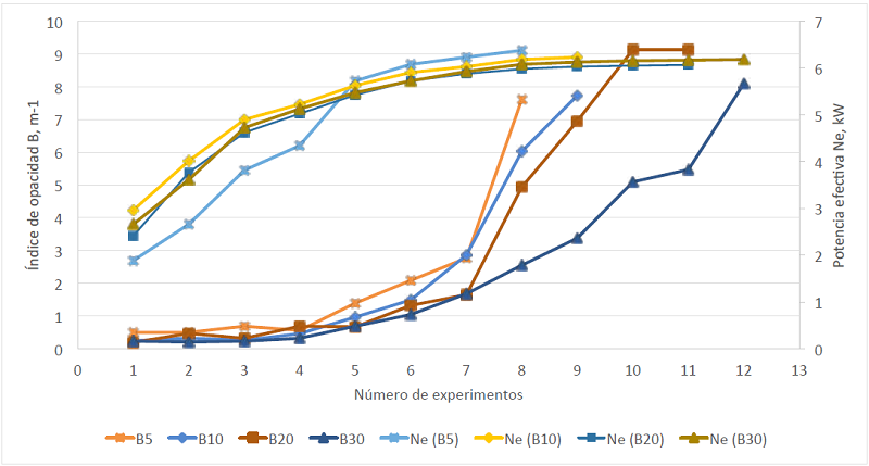 En la figura 5, se muestra la variación del índice de opacidad y la potencia efectiva de las mezclas diésel/biodiesel, comparadas con el combustible diésel comercial B5 para diferentes cantidades de toma de datos experimentales a frecuencia de rotación constante del motor de 1600 r.p.m. La tendencia del índice de opacidad es similar para B5, B10, B20 y B30, a bajas cargas a pesar del incremento de la viscosidad (Corsini et al., 2016) de las mezclas con mayor contenido de biodiésel comparado con el B5, pero a carga media el máximo valor corresponde a B5. Por otro lado, a cargas altas del motor, el mayor valor de índice de opacidad corresponde a B20 en comparación con las otras mezclas. Las tendencias de variación del índice de opacidad de todos los combustibles utilizados según la figura 5, son afectados por la baja relación de carbono/hidrógeno, contenido de oxígeno en las mezclas diésel/biodiésel y la carga sobre el motor (Gopal et al., 2014; Cheung et al., 2015).
