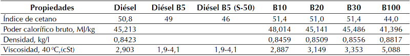 El contenido de oxígeno en el biodiésel es alto, por tanto, los valores de energía de masa son bajos comparados con el combustible diésel puro. Al aumentar la cadena de carbono del ácido graso (para un nivel de instauración constante), la fracción de masa de oxígeno disminuye y esto conlleva al aumento del poder calorífico. En la tabla 2 se observa que el poder calorífico bruto de las mezclas B10 y B30 es mayor, comparado con el combustible diésel puro (Saxena et al., 2013).