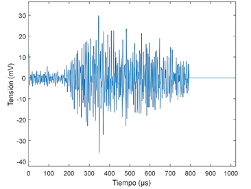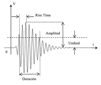 En el interior de los materiales sometidos a esfuerzos se generan ondas elásticas producidas por la deformación del material y otras fuentes, como las debidas al crecimiento de fisuras, movimiento de dislocaciones, rotura de inclusiones, etc. La técnica de emisión acústica (EA) permite obtener información de estos procesos, detectar y medir estas ondas con sensores piezoeléctricos que transforman la señal mecánica en señal eléctrica. Las ondas elásticas provenientes del interior del material son registradas sobre la superficie, donde se ubican los sensores piezoeléctricos. Estas señales, en la forma de ráfagas llamadas hits, son procesadas para su posterior análisis. La señal eléctrica de EA es de muy baja amplitud (10 µV) y de alta frecuencia (50 kHz a 1 MHz). Como se ilustra en la figura 1, exhibe eventos discretos con forma de pulsos oscilantes que alcanzan una amplitud máxima en un tiempo de subida (rise time) de la señal, para luego amortiguarse.