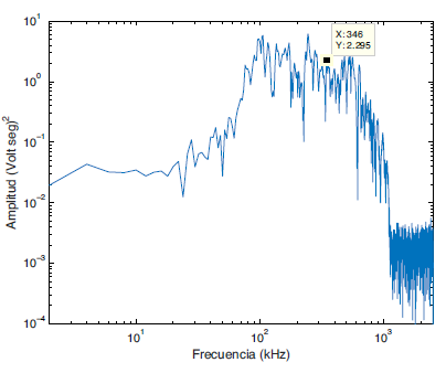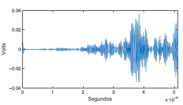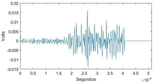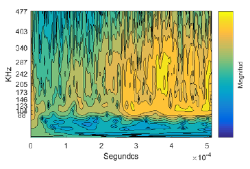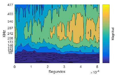 A partir de la transformada Wavelet de una señal pueden filtrarse las frecuencias indeseadas eliminando los coeficientes correspondientes y reconstruyendo la señal. En la figura 9 se ilustra el hit anterior filtrado entre 240 kHz y 300 kHz, y en la figura 10, su correspondiente escalograma.