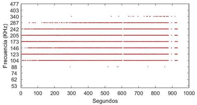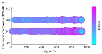 Al aplicar la CWT a cada hit registrado en el ensayo se conocen sus componentes de frecuencia localizadas en el tiempo. El gráfico de la figura 11 representa para cada hit la frecuencia de mayor energía. En el eje vertical se expresa la frecuencia en kHz y en el eje horizontal el tiempo real en segundos de ocurrencia del hit durante el ensayo. Se aprecia que las componentes de mayor frecuencia se manifiestan hacia el final del ensayo.