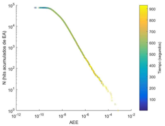 (5)Luego se la vincula con la cantidad N de hits cuya energía supera un valor dado de AEE. La figura 13 ilustra esta relación para la probeta del ensayo, con los hits reconstruidos luego del filtrado entre 240 kHz y 300 kHz. Para cada hit representado se asigna además un color que indica su ocurrencia en el tiempo. Una vez más se aprecia que los hits de mayor energía ocurren hacia el final del ensayo.