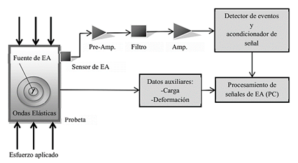 Se emplearon tres sensores piezoeléctricos para monitorear la EA. En la superficie de la probeta se colocaron dos sensores, uno sintonizado a 60 kHz y otro a 150 kHz. Al tercero, de banda ancha, se lo adhirió al plato de carga inferior teniendo en cuenta la propiedad de buena guía de onda del metal involucrado. El equipo de EA se completó con una placa de dos canales PCI - 2 de PAC (Physical Acoustic Corporation) y se utilizó el software comercial AEWIN para el análisis y determinación de la mayoría de los parámetros característicos de las señales.