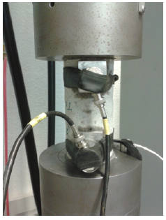 Siguiendo el trabajo de Filipussi et al. (2015), se ensayaron cuatro probetas cilíndricas de 75 mm de diámetro y 150 mm de largo, sobre testigos de andesita extraídos in situ de roca del Cerro Blanco, provincia de San Juan, Argentina. Estas probetas fueron ensayadas a compresión simple uniaxial y llevadas a la rotura. Se utilizó una máquina marca CGTS de 100 toneladas de capacidad, de tipo servohidráulica y lazo cerrado donde se impuso una velocidad de desplazamiento de actuador de 0,12 mm/min. La figura 3 muestra el arreglo experimental de una probeta de andesita instrumentada con sensores de EA.