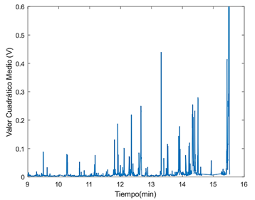 Los hits seleccionados para la obtención de la frecuencia esquina corresponden a aquellos intervalos de tiempo donde el valor cuadrático medio RMS de las señales alcanza un máximo relativo, como se muestra en la figura 6.