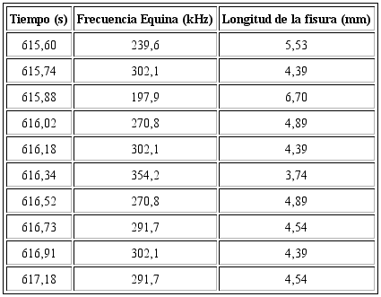 En este trabajo se estimó la longitud de las fisuras con esta última ecuación, a través de la medición de las frecuencias esquinas de las señales adquiridas en los instantes de tiempo en que la energía del hit alcanza valores máximos relativos. Se consideró que ( = 0.7 por ser el material frágil, que la detección fue aproximadamente en la línea de avance de la fractura ( ( = 0º) y que la velocidad de propagación de onda en la andesita es