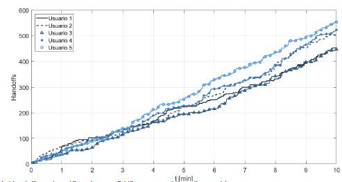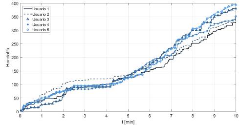 Por otro lado, la tendencia encontrada en el promedio de los handoffs está condicionada por el hecho de que los primeros US van a ocupar primero las bandas de frecuencia libres, por lo que los últimos deben realizar una mayor búsqueda.
