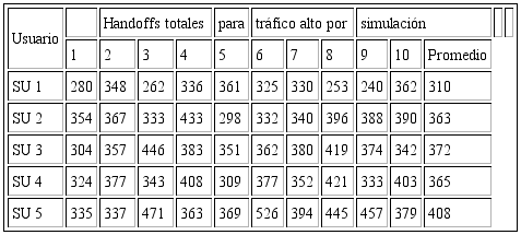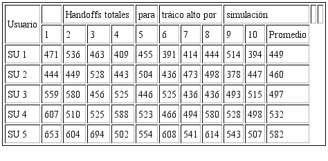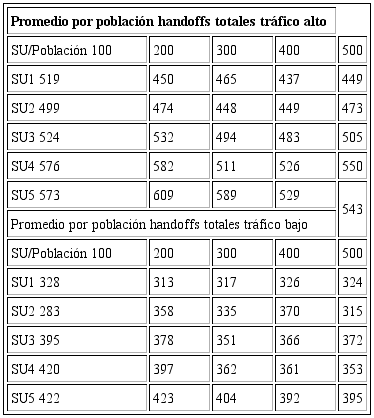 Según lo planteado en las secciones anteriores, en la tabla 1. se muestran los resultados promedio de cinco simulaciones, para handoffs totales (tráfico alto y bajo), en una red de radio cognitiva con cinco US y para cada nivel de población.