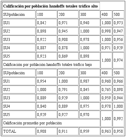 Al obtener los resultados anteriores se procede a calcular una calificación del rendimiento por usuario para cada nivel de población, teniendo como referencia el número de handoffs totales: se compara el número de handoffs por US, con el valor mínimo obtenido entre todas las poblaciones; así se alcanza una calificación que puede tener un valor menor o igual a 1; donde 1 indica la población con la que se logra el menor número de handoffs totales para su correspondiente usuario, y una calificación menor a esta cifra desciende conforme el número de handoffs aumenta.