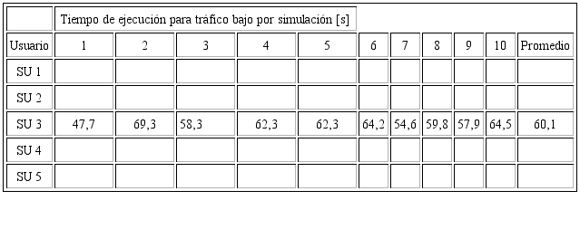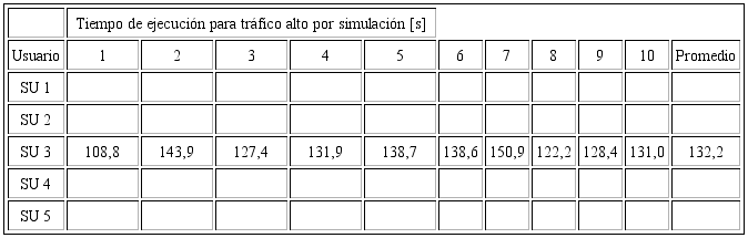 Los tiempos de ejecución encontrados en las tablas 5 y 6. no son excesivos si se comparan con el tiempo de evaluación; para la traza de nivel de tráfico alto se obtuvo en promedio de ejecución 132,2 s, lo que corresponde a 22,03 % del tiempo de evaluación (600 s), y para la traza de nivel de tráfico bajo se obtuvo en promedio un tiempo de ejecución de 60,1s, lo que corresponde a 10,01 % del tiempo de evaluación (600 s). Son cifras aceptables, si se piensa en una posible aplicación real en el futuro en la que se necesitan tiempos de ejecución menores que el tiempo de evaluación.