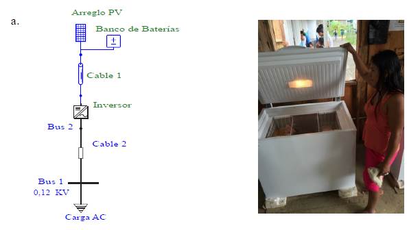 La microrred del centro educativo tiene una estructura con un sistema fotovoltaico de 1500 W y una carga con un consumo de 750 W. El sistema fotovoltaico se implementó con un banco de baterías y un inversor, como se muestra en la figura 1. La simulación del arreglo fotovoltaico de la escuela y del centro de refrigeración se realizó en MatlabR2016a/Simulink.
