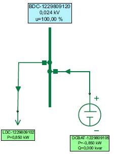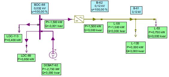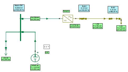 Al realizar el flujo de carga se puede observar que este cumple adecuadamente y es coherente; es decir, converge, y las tensiones en las barras es correcta, puesto que sus valores están en 0,98 y 1 en p.u. Además, no se presentan elementos ni líneas sobrecargadas, lo cual indica que su implementación en el software es exitosa y logra suplir la demanda tanto de la carga DC corno AC, a la vez que mantiene las condiciones técnicas de la microrred.