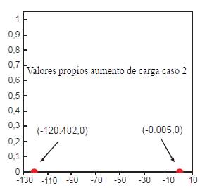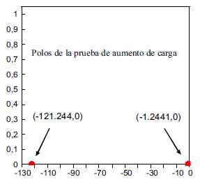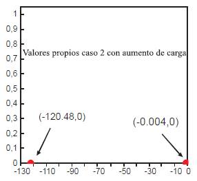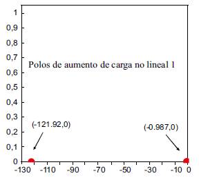 La potencia reactiva positiva indica que la carga es de tipo inductivo. Al realizar el flujo de potencia con la nueva carga se aumenta la potencia de la fuente, debido a que la conexión de esta nueva carga demanda más energía; es importante resaltar que no se ve afectada la convergencia del flujo, y este cumple correctamente como en los casos anteriormente mencionados. Luego se lleva a cabo el análisis de pequeña señal, del cual se obtienen los valores propios del sistema, como se muestra en la figura 12. la posición de los polos indica que el sistema no pierde la propiedad de estabilidad ante dicha perturbación.