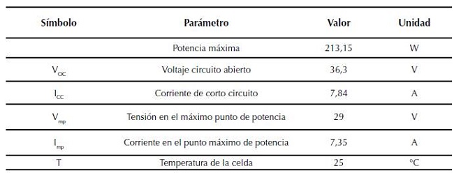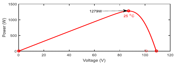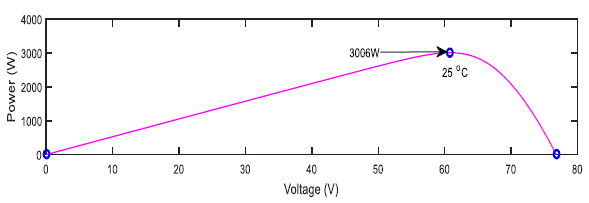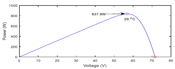 El resultado representa que la demanda de energía de la escuela es cubierta por los paneles fotovoltaicos en los periodos donde la irradiación es mayor o igual a 1000 W/m^2. La figura 2. muestra la potencia máxima obtenida a partir de los parámetros indicados en la tabla 2.