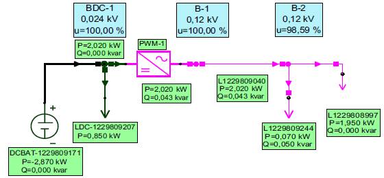 Dado que muchas de las cargas en el resguardo indígena requieren alimentación AC, para alumbrado y electrodomésticos de primera necesidad, se debe utilizar un inversor en el sistema. El voltaje requerido es de 120 Vac, por consiguiente, se debe aumentar el voltaje además del cambio de corriente continua a corriente alterna. Se propone un inversor con tensión de entrada de 24 Vdc y potencia de salida 2000 W. Una vez implementado el sistema en Neplan, se ejecuta el flujo de carga para analizar el sistema eléctrico en estado estacionario. La figura 14. demuestra que el planteamiento de expansión del sistema opera correctamente, y se obtiene la magnitud del voltaje en cada nodo, y la potencia activa y reactiva que fluye en cada línea.
