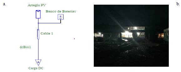 El análisis de este sistema fotovoltaico se lleva a cabo mediante el simulador Neplan. Se modela con una fuente DC, un inversor DC/AC, una carga AC (1950 W) y una carga DC (850 W). En el desarrollo de este caso se plantea un banco de baterías como la fuente de generación, por tanto, la potencia activa suministrada no es la generada por los paneles FV sino la demanda por la carga, es decir 2800 W.