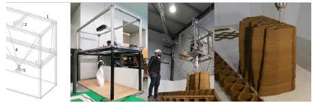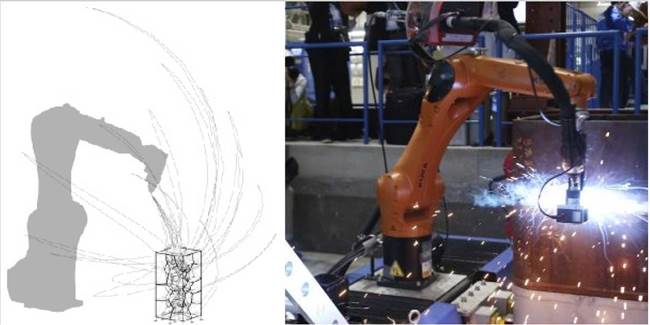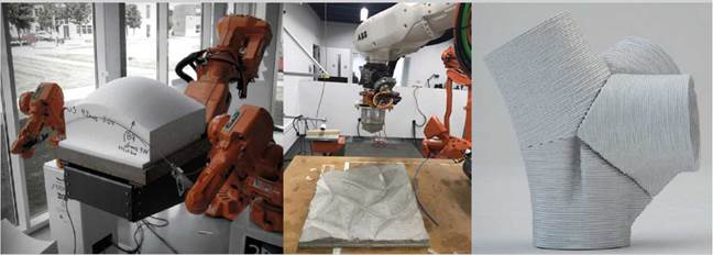 Además, si se combinan robos industriales con técnicas basadas en extrusión, como contour crafting (Khoshnevis, Hwang, Yao y Yeh, 2006), se obtienen estructuras en concreto sin la necesidad de utilizar encofrados (Nematollahi, Xia y Sanjayan, 2017). El MIT propone utilizar un sistema robusto que permita fabricar en el sitio de trabajo, estructuras arquitectónicas personalizadas utilizando información del entorno. El sistema se compone por una plataforma móvil y un brazo robótico que a su vez está compuesto por un brazo eléctrico y uno hidráulico. El experimento que se llevó a cabo para evaluar su operación fue construir un domo de 14,6 metros y 3,7 metros de alto; con un tiempo de 13,5 horas (Keating, Leland, Cai y Oxman, 2017).