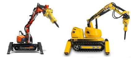 Una de las grandes compañías que se dedican al desarrollo de robots para actividades de demolición es Husqvarna; sus robots son teleoperados, tienen un sistema de locomoción para desplazarse a lo largo de la obra y, además, están provistos con un brazo que permite intercambiar herramientas dependiendo de la tarea que se quiera realizar (excavar, palear, agarrar, zanjar, aplastar, remover, etc.). Su alcance llega hasta los 5,5 metros, tienen una alta relación potencia/peso, pueden pasar por puertas de tamaño estándar y tienen un bajo centro de masa que les permite mayor estabilidad (Husqvarna, 2019).