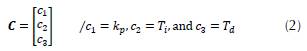 Where the new constants correspond to the tuning of the PID controller. These can be rewritten vectorially as (Equation 2):