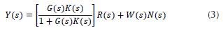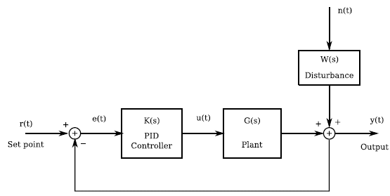 In Figure 1 K(s) is the transfer function of the PID controller, G(s) is the transfer function of the plant, r(t) is the reference signal for controlling the plant, e(t) is the system error, u(t) is the controlled input, n(t) is the disturbance, W(s) is the disturbance dynamics, and y(t) is the output signal. According to Figure 1 (Equation 1):