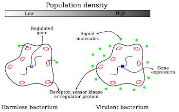 The tuning process consists of finding the vector C so that the performance function (a function that evaluates the steady-state error) is minimal. As a search scheme, we propose a simplified bacterial interaction model that includes QS. Our model of bacterial interaction is based on the cellto-cell communication. We have technically called this process local communication between artificial agents that emulate biological bacteria. Biological bacteria read local information from the identification of chemical elements in the environment and their concentration densities (Martínez, Hernández, and Acero, 2017). The QS follows the principles of this local communication scheme, with the particular characteristic that it allows coordinating the collective behavior of the bacterial population from certain specific readings. For instance, one of these readings can determine that the bacterial population is high and can activate a collective attack mechanism on the host environment (Figure 2). Bacteria deposit chemical information in the environment, and when the concentration is elevated they decode an attack action written in their genetic code. It is possible to imitate this behavior in artificial agents, making bacteria move to steady-state zones (possible solutions to the problem) that they find attractive (as if they were looking for food) guided by the performance function of the problem. When the number of agents in a state-space zone exceeds a quorum threshold T, the QS is activated making this zone more attractive. The point in the state space where the greatest number of individuals are grouped corresponds to the optimal solution of the problem.