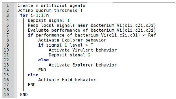 Depending on the signal concentration in the local environment, a bacterium evaluates the number of neighboring bacteria in the same position (within a radius of neighborhood), and if the concentration exceeds the threshold of quorum T, the QS is activated. When the QS is activated, the bacteria place a second signal in the environment that increases the performance value of its position, attracting other bacteria more quickly. The coordinates of the meeting point of the bacteria correspond to the value of vector C.