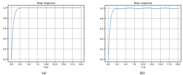 Figure 4. shows the behavior of this design. Image 4(a) shows the step response of the system without applying disturbances, while Image 4(b) shows the same behavior with disturbance applied. In both cases, there is a short rise time and scanty steady-state error. Image 4(b) also shows how the control responds positively to the disturbance.