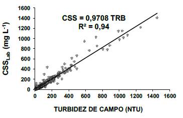 Los datos continuos de CSS durante todo el período de estudio (2009-2012) se calcularon a partir de una buena relación entre la turbiedad (TRB) medida en campo y la CSS obtenida en el laboratorio (figura 2). Esta regresión lineal (R2 = 0,94) indica que las propiedades físicas del material particulado en suspensión tienden a ser estables, señalando que no se presentan variaciones importantes en la fuente de los sedimentos debido a la homogeneidad de la cuenca en términos del tipo y uso del suelo (Walling y Webb, 1985).