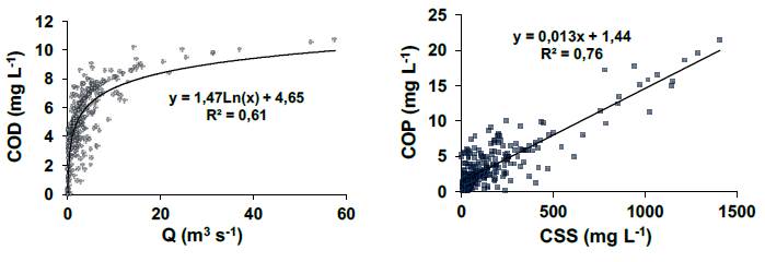 Para obtener datos continuos de la concentración de COD y COP, se establecieron ecuaciones de regresión con el caudal durante los eventos de crecida (R2 = 0,61) y con CSS (R2 = 0,76), respectivamente (figura 3).