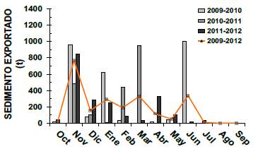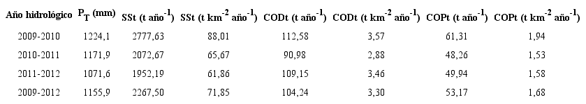 Resultados: La exportación total se estimó en 2267,6 t de SS, 104,3 t de COD y 53,3 t de COP, representando tasas en t km-2año-1 de 71,85 para SS; 3,30 para COD, y 1,68 para COP (valores promedio de los tres años hidrológicos estudiados).