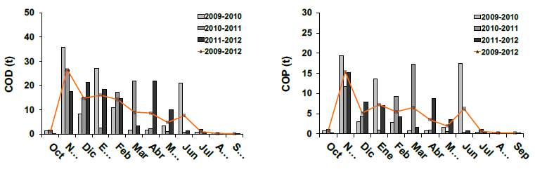 Particularmente, los principales aportes de SS, COD y COP tuvieron lugar desde el mes de noviembre hasta marzo (otoño/invierno), estaciones donde se originaron con una mayor frecuencia los eventos de lluvia intensa y continua (figura 5).