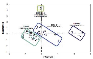 Igualmente, en la figura 7 se observa la distribución de las crecidas entre los factores I y II que se obtuvieron del ACP, identificando numéricamente cada uno de los eventos de acuerdo con la tabla 1.