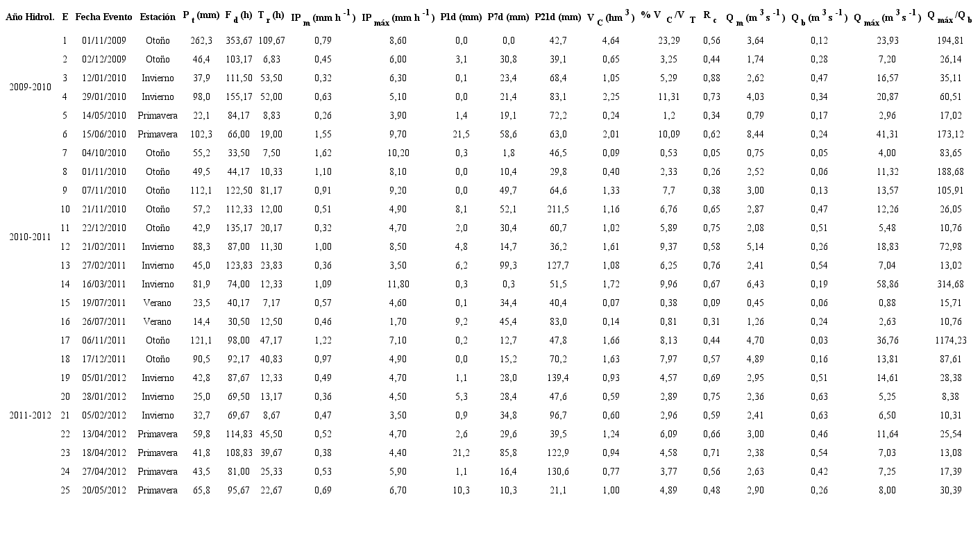 Las variables antecedentes comprenden la precipitación acumulada de un día antes (P1d, mm), siete días antes (P7d, mm) y veintiún días antes (P21d, mm) del inicio de la crecida, así como el caudal base también anterior al inicio de la crecida (Qb, m3 s-1). Las variables de la crecida comprenden la precipitación total causante de las crecidas (Pf, mm), intensidad para la precipitación media por hora (IPm, mm h-1), máxima intensidad para una precipitación por hora (IPmáx, mm h-1) durante el evento. Asimismo, se expresaron: el volumen agua total producida o volumen de la crecida (VC, hm3), la duración total de la crecida (Fd, h), el caudal medio (Qm, m3 s-1), el tiempo (Tr, h) para alcanzar el caudal máximo de crecida (Qmáx, m3 s-1) y se contemplaron parámetros como el coeficiente de la crecida Rc = VC / Pf (VC y Pf en mm) y la relación de caudales Qmáx/Qb. Los resultados del porcentaje de aporte de agua de la crecida con respecto al volumen de agua exportada durante el respectivo año hidrológico también son incluidos en la tabla 1.
