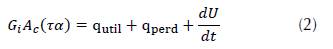 Para esto, se establece el balance de energía del dispositivo solar, en el que se iguala la energía incidente sobre el colector dada por GiAc(xa), con el calor útil qutil, las pérdidas totales de energía (qperd) y la energía almacenada por el mismo colector dU/dt. La ecuación (2), expresa todo así: