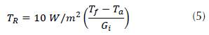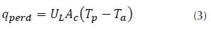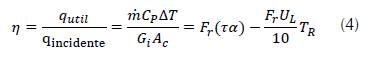 Donde: UL es el coeficiente de pérdidas globales del colector, AC es el área del colector, TP es la temperatura de la placa y Ta es la temperatura ambiente. Si se asume dentro del balance de energía que dU/dt tiende a cero cuando la temperatura interna del sistema es igual a la temperatura ambiente, y el sistema tiene el tiempo suficiente para que el calor útil corresponda a la energía que incide (constante de tiempo del sistema), y se aplican condiciones de frontera, obteniendo como parámetros de temperatura, la temperatura ambiente Ta, la temperatura del fluido a la entrada del colector Tf, la masa de agua que fluye por el colector m, el calor específico del agua (Cp) y el coeficiente de pérdidas globales (UL), entonces la eficiencia instantánea para el colector solar, tipo aleta, expresada en la ecuación (1), da como resultado: