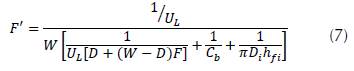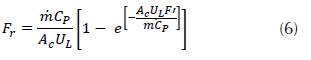 Aquí, F' es el factor de eficiencia del colector, expresado a continuación en la ecuación (7) como: