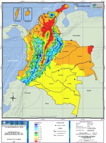 In Colombia, the temperature is variable and depends on factors such as the altitude, resulting in diverse climates-values from -8 degrees Celsius up to approximately 45 degrees Celsius may be present; (Instituto de Hidrología, Meteorología y Estudios Ambientales, 2015), (Hurtado M, 2015). Figure 2 shows the variability in temperature throughout Colombia.