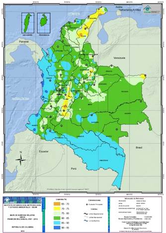 According to the map shown in Figure 3, the relative humidity in Colombia varies depending on the place. The zones located South and West of the country (the regions of Amazonas, Caquetá, Putumayo, Vaupes, and Chocó) have more plants, trees, rivers, and wetlands and have values between 85 and 95% of relative humidity. On the other hand, zones located East of the country have higher density of forests and have a relative humidity that varies from 75 and 85% (the map shows these zones in green). Finally, the region called “La Guajira” is mostly desertic and has the lowest relative humidity values.