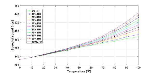 However, there are no dry-air conditions in this case, so if there is a variation in relative humidity, Eliakim presents an equation that relates the relative humidity and temperature for determining the speed of sound (Eliakim, 2014):