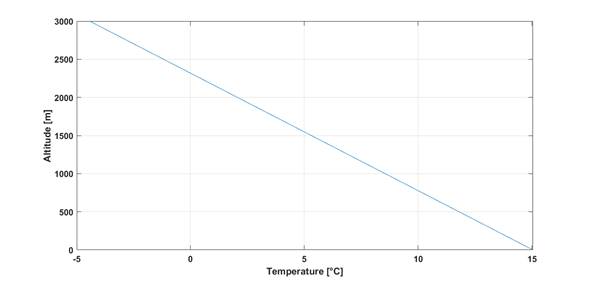 The International Standard Atmosphere (ISA) models the temperature profile for changes of temperature in the atmosphere (Figure 6). The behavior of temperature at tropospheric level is linear, and the temperature at the sea level is 15 °C for the ISA model.