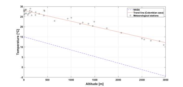 Figure 8 shows the equation from NASA in a blue dashed line; the average temperature taken from each meteorological station in Colombia is represented with small circles, and the trend of these values is drawn as a continuous red line (the correlation coefficient r2 of 0.954 and uncertainty of linear terms was Δa = 1.92 x 10-4 and Δb = 2.32 x 10-1) Looking at the behavior of the equation from NASA and the resulting graph in Figure 6, it is possible to say that they are similar: in both cases the temperature at 0 m is approximately 15 °C. However, these results differ from the data taken from the meteorological stations in Colombia that establish 28,045 °C as the approximate temperature at 0 m. The equation obtained for temperature in function of the altitude with data measured in Colombia is: