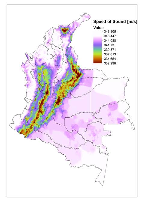 Figure 9 shows the map of speed of sound in Colombia using equation 4: