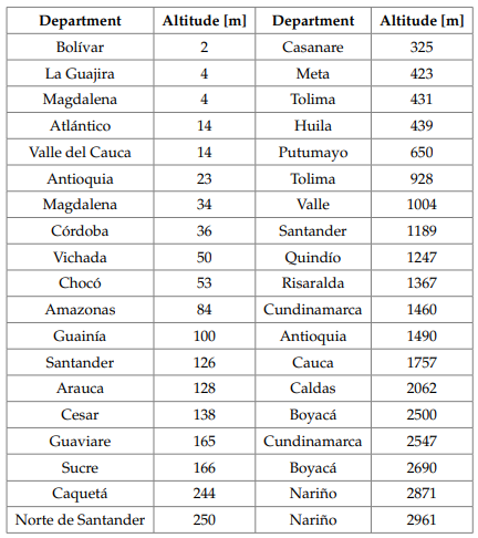 The IDEAM has 39 meteorological stations, located in different places with different altitudes (0 - 3000 meters) throughout the country. Table 1 shows the list of each station and its altitude (the table lists only 38 stations; the station #39 is located in San Andres Island, which was not considered during this research).