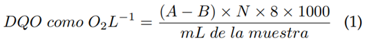 La DQOtotal fue determinada por el método de reflujo cerrado. (Rice, Baird e Eaton, 2012). Primero, fueron tomados tubos de digestión de 16×100 mm, adicionando 2,5 ml de muestra, 1,5 ml de solución digestora y 3,5 ml de solución reactiva de ácido sulfúrico, para así completar un volumen total de 7,5 ml. También fue realizada una prueba en blanco, usando agua destilada como muestra (2,5 ml) y las mismas proporciones de los reactivos anteriormente en mención. Luego, se colocaron los tubos de ensayos en un reactor a 150 °C por un periodo de 2 horas y luego fueron dejados en reposo a temperatura ambiente durante 30 minutos. Las soluciones de los tubos de ensayos fueron pasadas a un Erlenmeyer, siendo añadidas de 2-3 gotas de indicador de ferroína, para una posterior titulación con FAS 0,1 N (solución que debe ser estandarizada a cada uso), hasta obtener un cambio de color de azul verdoso a café rojizo. La cantidad de FAS utilizado durante la titulación hasta el cambio de color fue registrada para luego calcular la DQOtotal mediante la ecuación (1), de acuerdo con el método titulométrico: