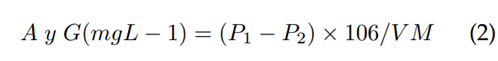 Para la determinación de los aceites y grasas (A y G) se utilizó el método gravimétrico. Se agregaron 170 ml de muestra de ARLC en un balón de separación; luego se adicionaron 2 ml de ácido clorhídrico (Merck 37 % de pureza) y 20 ml de xileno (Applichem Panreac) como solvente. Posteriormente, se realizó el proceso de extracción de la solución y se repitió dos veces con 5 ml del solvente para eliminar residuos de grasas; el resultado era recolectado en un vaso de precipitado previamente secado y pesado (P1), el cual contenía papel de filtro para retener la materia orgánica y dejar pasar el Na2SO4. Por último, se dejó evaporar la solución hasta alcanzar peso constante (P2). La ecuación (2) permitió determinar la concentración de A y G: