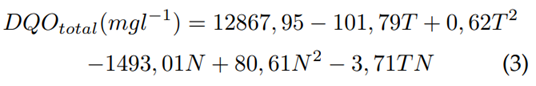 El método de análisis de regresión múltiple fue usado para evaluar los resultados del experimento DCA en diseño factorial (2 factores). Así, ecuaciones polinomiales de segundo orden fueron utilizadas para expresar las relaciones empíricas entre las variables respuesta (parámetros fisicoquímicos) e independientes (tiempo y número de electrodos). El modelo empírico final desarrollado para estimar el desempeño de la DQOtotal a lo largo del tratamiento es presentado en la ecuación (3):
