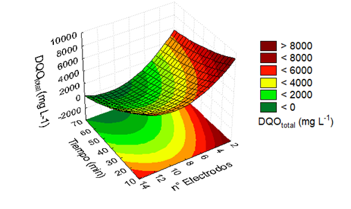 Donde, T es el tiempo en minutos y N corresponde al número de electrodos. Los términos positivos indican ese mismo efecto en la DQOtotal, mientras que los términos negativos indican que el parámetro tiene un efecto negativo. En la figura 3 se ilustra el comportamiento de la DQOtotal a través del tratamiento de EC. Así, el sistema de EC indica que, a medida que el tiempo de tratamiento y el número de electrodos son aumentados, se obtiene una reducción de la concentración de la carga orgánica de las ARLC referente a la reducción de la DQOtotal.