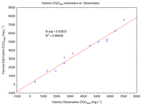 Las relaciones entre los valores estimados de DQOtotal a partir del modelo de la ecuación (3) y los valores observados fueron muy próximos a una correlación lineal significativa con coeficiente de determinación R2= 0,97 (figura 5), lo cual indicó que aproximadamente 97 % de la varianza experimental puede ser explicada por la ecuación de segundo orden ajustada, como se presenta en las figuras 3 y 4.