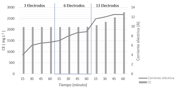 Estas series de reacciones permiten inducir que, durante la EC, pueden formarse sales mediante la reacción del Fe+3 y Fe+2 con diversos componentes del agua residual; lo que configura una variedad de sales metálicas que ocasionan el aumento de la CE de las ARLC durante el tratamiento y, consecuentemente, ocasiona incrementos graduales de la corriente eléctrica hasta alcanzar 11,6 A, como se expresa en la figura 5.